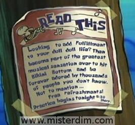 Une affichette est placardée sur tous les murs de la ville (et même dans les toilettes du capitaine Krabs, la douche de Larry, ...) pour recruter....